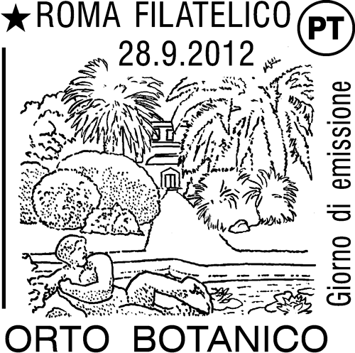| Vignetta | sono realizzate con l'impostazione grafica della serie di riferimento e raffigurano scorci dei rispettivi orti botanici e precisamente Orto Botanico di Roma, in primo piano la Fontana dei Tritoni, un viale delimitato da una rigogliosa vegetazione e, sullo sfondo, il Palazzo Riario-Corsini. Completano il francobollo la leggenda "ORTO BOTANICO DI ROMA" , la scritta "ITALIA" e il valore "€ 0,75". |