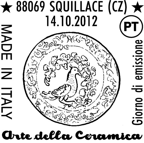 Riproduce, su un fondo chiaro in cui si ripetono motivi floreali, alcune produzioni e lavorazioni di pregio dell'arte della ceramica legate alla storica tradizione della località di Squillace: piatto in ceramica raffigurante un volatile, tipico esempio di manufatto artigianale di uso domestico, esposto presso il Museo Diocesano di Santa Severina. Completano il francobollo le rispettive leggende "MADE IN ITALY", "SQUILLACE" e "ARTE DELLA CERAMICA", la scritta "ITALIA" e il valore "€ 0,60".