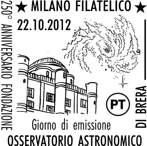 | Vignetta | raffigura un particolare del palazzo dell'Osservatorio Astronomico di Brera e della Cupola Zagar, sullo sfondo la galassia vortice M51, ripresa dal Telescopio Nazionale Galileo. Completano il francobollo la leggenda "OSSERVATORIO ASTRONOMICO DI BRERA 1762-2012" e "...E STUDIAMO", la scritta "ITALIA" e il valore "€ 0,60". |