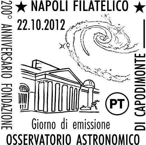 | Vignetta | raffigura la facciata principale dell'edificio monumentale in stile neoclassico dell'Osservatorio Astronomico di Capodimonte con la galassia denominata ARP 273, fotografata con il telescopio spaziale Hubble. Completano il francobollo la rispettiva leggenda "OSSERVATORIO ASTRONOMICO DI CAPODIMONTE 1812- 2012" e "DUECENTO ANNI DI LUCE", la scritta "ITALIA" e il valore "€ 0,60". |
