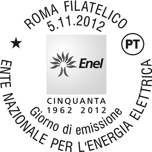 | Vignetta | riproduce il logo dell'ENEL personalizzato in occasione del 50º anniversario della fondazione con le date "1962 2012"; parte del logo e le date si riflettono specularmente verso il basso, facendo intravedere il numero '50'. In alto è raffigurata la rielaborazione artistica di un particolare del logo. Completano il francobollo la scritta "ITALIA" e il valore "€ 0,60". |