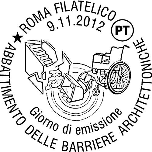 | Vignetta | raffigura una sedia a rotelle dotata di una benna che, idealmente, abbatte una rampa di scale, a rappresentare il principio della libera fruibilità degli spazi nei confronti di coloro che soffrono di una ridotta capacità motoria. Completano il francobollo la leggenda "ABBATTIMENTO DELLE BARRIERE ARCHITETTONICHE", la scritta "ITALIA" e il valore "€ 0,60". |