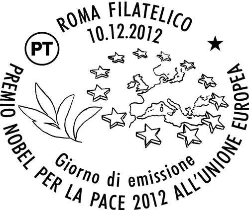 | Vignetta | raffigura, su un fondino blu, il profilo geografico dell'Europa circondata dalle dodici stelle dell'Unione Europea e, a sinistra in basso, un ramo di ulivo stilizzato, simbolo della pace. Completano il francobollo le leggende "PREMIO NOBEL PER LA PACE 2012" e "UNIONE EUROPEA", la scritta "ITALIA" e il valore "€ 0,75". |