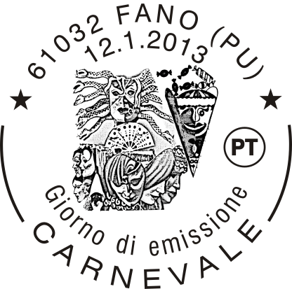 | Vignetta | raffigura alcune maschere legate al carnevale di Fano e il "prendigetto", un caratteristico contenitore usato dalla folla per raccogliere dolciumi lanciati dai carri durante la festa, ritenuta la più popolare e importante delle Marche e la più antica d'Italia. Completano il francobollo la leggenda "CARNEVALE DI FANO", la scritta "ITALIA" e il valore "€ 0,60. |