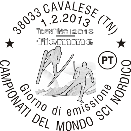 | Vignetta | raffigura, sullo sfondo il profilo delle montagne che circondano la Val di Fiemme e, in grafica stilizzata, alcuni atleti impegnati in specialità dello sci nordico, come il salto dal trampolino e il fondo; in alto è riprodotto il logo ufficiale dei Campionati del Mondo di Sci Nordico 2013. Completano il francobollo la leggenda "CAMPIONATI DEL MONDO DI SCI NORDICO", la scritta "ITALIA" e il valore " 0,85". |