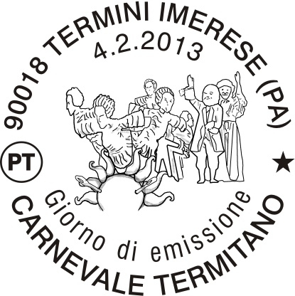 | Vignetta | raffigura, entro una cornice lineare, un carro allegorico con i pupazzi di cartapesta tipici del Carnevale Termitano e, sullo sfondo, Monte San Calogero; in alto a destra sono raffigurate le maschere di "u Nannu cà Nanna" caratteristiche figure della manifestazione sin dalle origini. Completano il francobollo la leggenda "CARNEVALE TERMITANO", la scritta "ITALIA" e il valore "€ 0,70". |