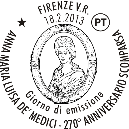 | Vignetta | Vignetta : riproduce il dipinto ad olio su tela ovale, dal titolo ºAnna Maria Luisa de' Medici', realizzato da Antonio Franchi tra il 1689 e il 1691, conservato in Palazzo Pitti a Firenze. Completano il francobollo la leggenda "ANNA MARIA LUISA DE' MEDICI", le date "1667 1743", la scritta "ITALIA" e il valore "€ 3,60". |
