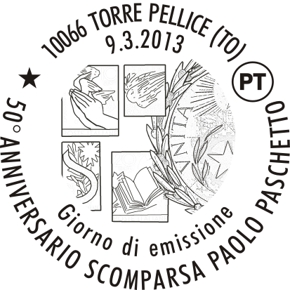 | Vignetta | riproduce, in un ideale collage, una serie di opere realizzate da Paolo Paschetto: a sinistra i bozzetti di quattro francobolli, a destra alcuni disegni e prove d'autore per il nuovo emblema dello Stato; in primo piano, in basso a destra, l'emblema della Repubblica Italiana. Completano il francobollo le leggende "PAOLO PASCHETTO 1885 - 1963" e "STUDI E BOZZETTI", la scritta "ITALIA" e il valore " € 0,70". |