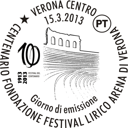 | Vignetta | raffigura, in grafica stilizzata, un particolare della gradinata dell'Arena di Verona e, in basso a sinistra, è riprodotto il logo del centenario della fondazione. Completano il francobollo la leggenda "FESTIVAL LIRICO DELL'ARENA DI VERONA", la scritta "ITALIA" e il valore "€ 1,90". |