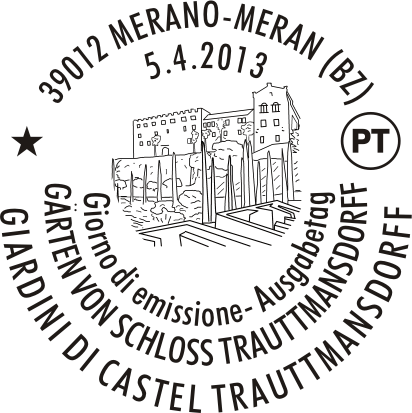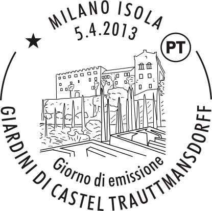 | Vignetta | Realizzato con l'impostazione grafica della serie di riferimento, caratterizzate, a sinistra, da una banda verticale composta da fiori e piante rappresentativi della flora dell'orto botanico dedicato, raffigura i giardini di Castel Trauttmansdorff di Merano: una veduta panoramica dei giardini con l'omonimo Castello. Completano il francobollo le rispettive leggende "GIARDINI DI CASTEL TRAUTTMANSDORFF DI MERANO", la scritta "ITALIA" e il valore "€ 0,70". |