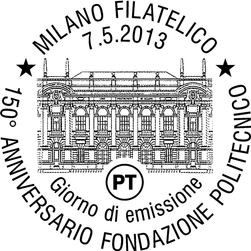| Vignetta | raffigura la facciata principale della sede del Politecnico di Milano, fondato nel 1863. Completano il francobollo le leggende "POLITECNICO DI MILANO" e "150º FONDAZIONE", la scritta "ITALIA" e il valore "€ 0,70". |