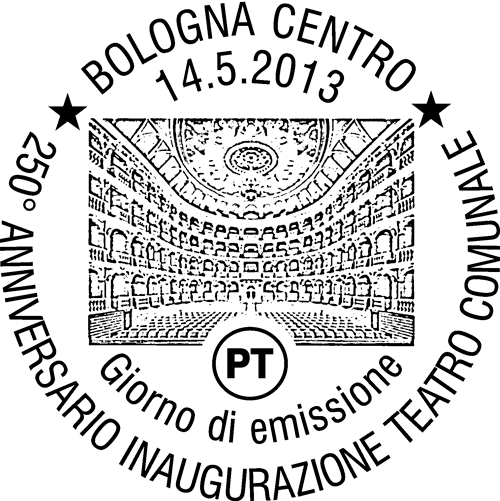 | Vignetta | raffigura l'interno del Teatro Comunale di Bologna realizzato nel XVIII secolo, con la sua amplia platea e le sontuose balconate. Completano il francobollo la leggenda "TEATRO COMUNALE DI BOLOGNA", la scritta "ITALIA" e il valore "€ 0,70". |