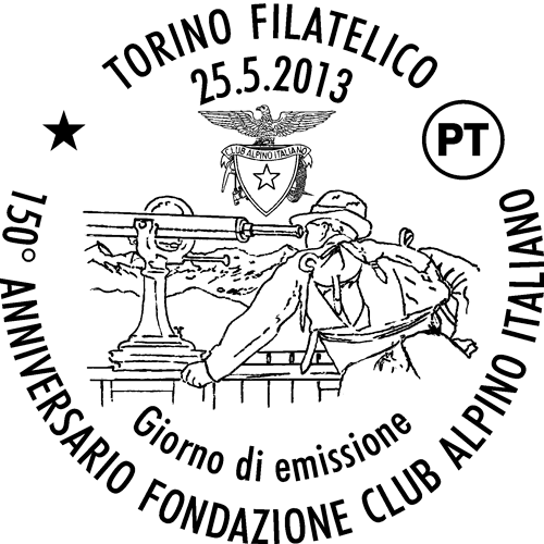 | Vignetta | riproduce un manifesto d'epoca del Club Alpino Italiano, dove un alpinista osserva un paesaggio attraverso un cannocchiale; in alto è riprodotto lo stemma del CAI. Completano il francobollo la leggenda "150º CLUB ALPINO ITALIANO", la scritta "ITALIA" e il valore "€ 0,70". |