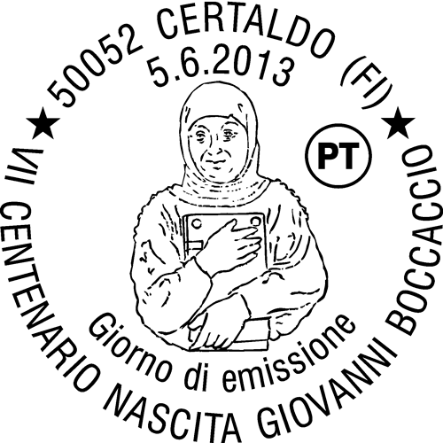| Vignetta | raffigura una scultura rinascimentale di Giovanni Francesco Rustici dal titolo Cenotafio di Giovanni Boccaccio, realizzata nel 1503 e conservata nella chiesta dei SS. Jacopo e Filippo in Certaldo. Completano il francobollo la leggenda "GIOVANNI BOCCACCIO 1313 - 1375", la scritta "ITALIA" e il valore "€ 0,70". |