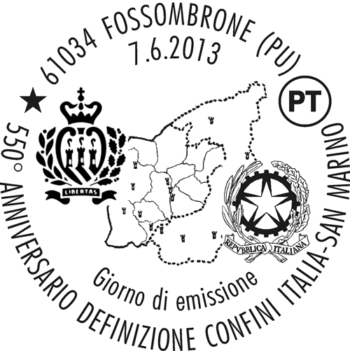 | Vignetta | raffigura un particolare della carta topografica d'epoca della Repubblica di San Marino; sulla carta sono indicati, tra l'altro, i quattro castelli concessi da Papa Pio II, nel 1463, con i Patti di Fossombrone. Completano il francobollo la scritta "ITALIA" e il valore "€ 0,70". Serravalle e Montelupo. |