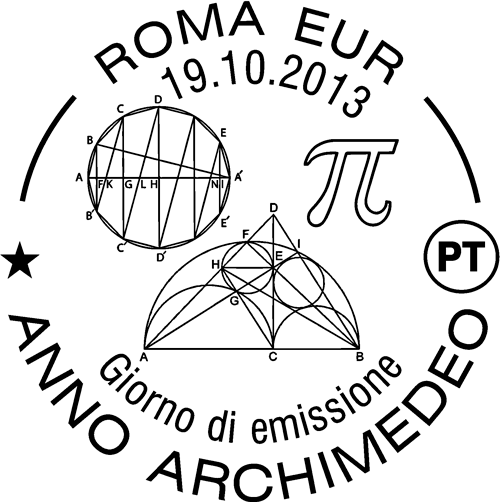 | Vignetta | riproduce, sull'intera superficie, la tabella dei numeri "pi greco" con le prime cifre decimali e, sovrapposti, in alto una costruzione geometrica tratta dal volume "Sulla sfera e il cilindro" e in basso un disegno tratto dal "Libro dei Lemmi"; in alto a destra, è raffigurata la lettera "pi" ("π") dell'alfabeto greco, detta anche numero di Archimede che rappresenta il rapporto tra la circonferenza e il diametro della stessa. Completano il francobollo la leggenda "ANNO ARCHIMEDEO", la scritta "ITALIA" e il valore " 0,70". |