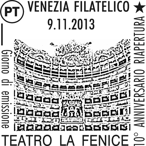 | Vignetta | riproduce l'interno del Teatro "La Fenice" di Venezia, distrutto completamente da un incendio nel 1996 e successivamente riedificato e riaperto il 14 dicembre 2003. Completano il francobollo la leggenda "TEATRO LA FENICE DI VENEZIA", la scritta "ITALIA" e il valore "€ 0,70". |