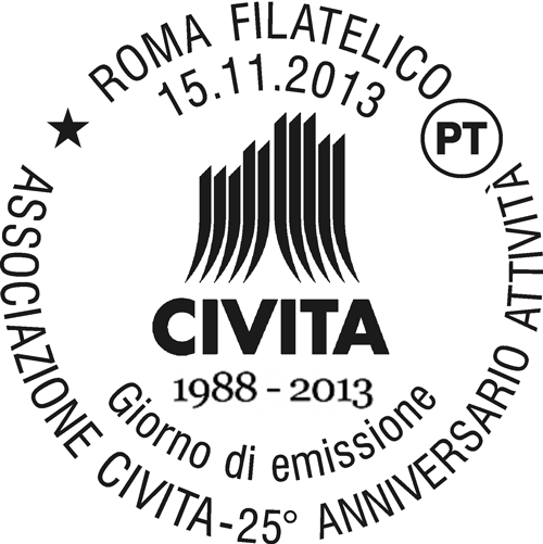 | Vignetta | raffigura, entro una cornice blu, in basso una veduta panoramica del borgo di Civita di Bagnoregio e in alto il logo dell'Associazione Civita. Completano il francobollo le date "1988 - 2013", la leggenda "25º ANNIVERSARIO", la scritta "ITALIA" e il valore " 0,70". |