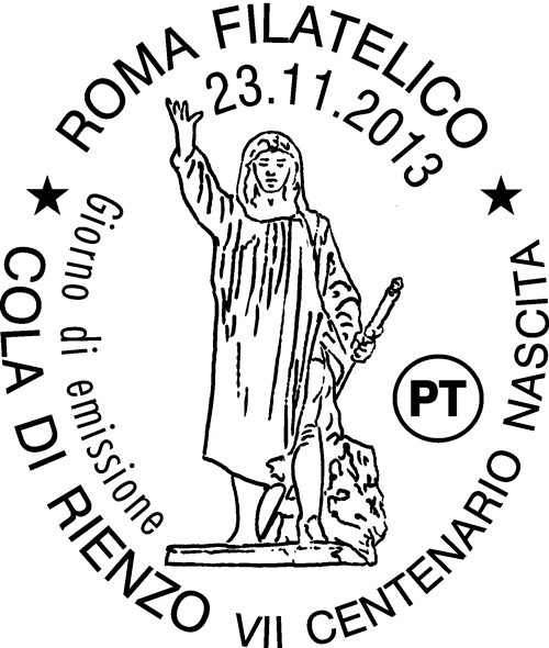 | Vignetta | raffigura un'immagine del tribuno romano Cola di Rienzo, ispirata alla statua realizzata dallo scultore fiorentino Girolamo Masini nel 1871 e collocata di fianco alla "Cordonata", la scala di accesso alla piazza del Campidoglio in Roma. Completano il francobollo la leggenda "COLA DI RIENZO", le date "1313 - 1354", la scritta "ITALIA" e il valore "€ 0,70". |