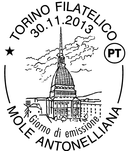 Mole Antonelliana. Una veduta prospettica del monumento simbolo in Torino inaugurato il 10 aprile 1889 e dal 2000, sede del Museo del Cinema; Completano il francobollo leggende "TORINO" e "MOLE ANTONELLIANA" la scritta "ITALIA" e il valore " 0,70".