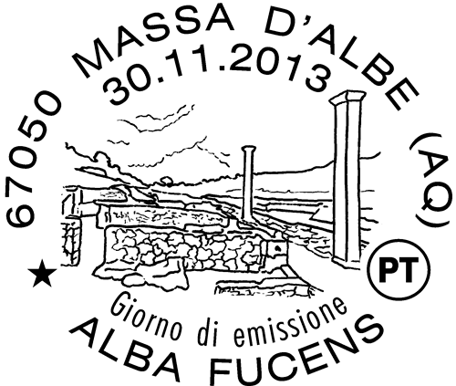 Alba Fucens. Uno scorcio del sito archeologico, antica città degli Equi colonizzata dai Romani all'inizio del IV sec. a.C., dove si evidenziano particolari della "Via dei Pilastri", così denominata per la presenza di 'pilastri in pietra' che formavano il porticato di alcune botteghe; Completano il francobollo la leggenda "ALBA FUCENS"; la scritta "ITALIA" e il valore " 0,70".