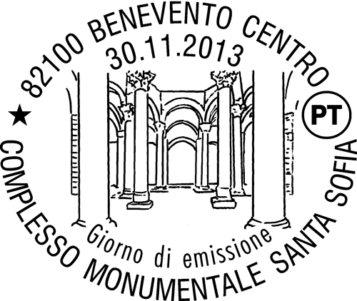 Complesso monumentale di Santa Sofia. Un particolare del colonnato posto all'interno della Chiesa del Complesso, simbolo dell'arte longobarda altomedievale e dichiarato nel 2011 Patrimonio mondiale dell'Umanità dall'UNESCO; Completano il francobollo le leggende "COMPLESSO MONUMENTALE DI S. SOFIA - BENEVENTO" la scritta "ITALIA" e il valore " 0,70".