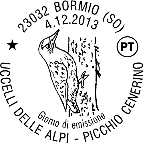 | Vignetta | Raffigura una specie di Uccelli delle Alpi nel loro ambiente naturale e in particolare: il Picchio cenerino. Completano il francobollo la leggenda "UCCELLI DELLE ALPI", le rispettiva denominazione "PICCHIO CENERINO", la scritta "ITALIA" e il valore "€0,70". |