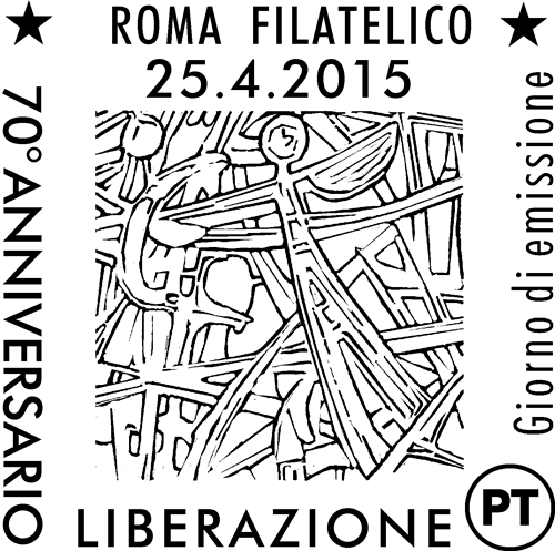 | Vignetta | raffigura un particolare del solenne cancello d’ingresso del Sacrario delle Fosse Ardeatine, opera in bronzo dello scultore Mirko Basaldella che rappresenta figurativamente l’orrore umano del crudele massacro perpetrato dalle forze di occupazione tedesche a Roma il 24 marzo 1944 nelle cave di via Ardeatina. Completano il francobollo le leggende “70° ANNIVERSARIO DELLA LIBERAZIONE” e “FOSSE ARDEATINE”, la scritta “ITALIA” e il valore “ 0,80”. |