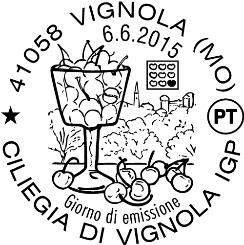 | Vignetta | raffigura un calice colmo di ciliegie in primo piano e sullo sfondo, un frutteto e una veduta della città di Vignola; in alto a destra, è riprodotto il logo del Consorzio di tutela della Ciliegia di Vignola IGP. Completano il francobollola leggenda “CILIEGIA DI VIGNOLA IGP”, la scritta “ITALIA” e il valore “€ 0,80”. |
