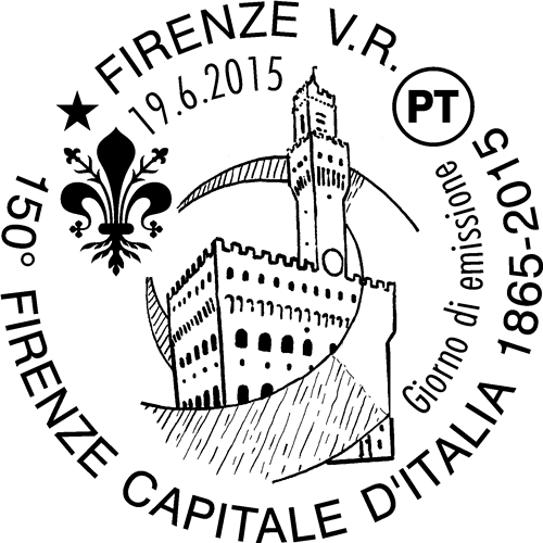 | Vignetta | raffigura Palazzo Vecchio avvolto da una fascia tricolore, con il giglio dello stemma del Comune di Firenze riprodotto in alto a sinistra. Completano il francobollo la leggenda “150° FIRENZE CAPITALE D’ITALIA”, le date “1865 2015” e il valore “€ 0,80”. |