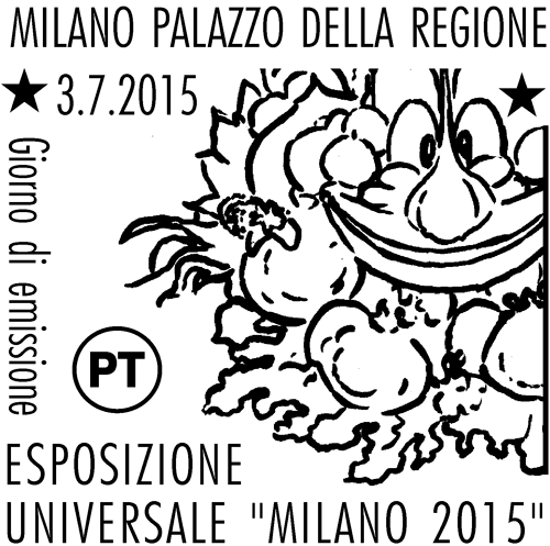 | Vignetta | riproduce un particolare della mascotte di Expo Milano 2015, affiancato dal logo della manifestazione. Completano il francobollo la leggenda “ESPOSIZIONE UNIVERSALE MILANO2015”, la scritta “ITALIA” e il valore “€ 0,80”. |
