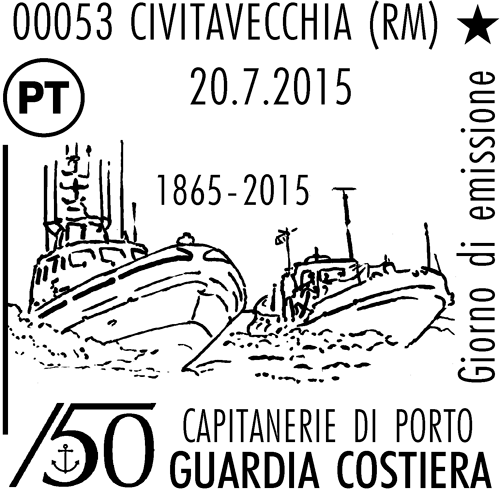 | Vignetta | raffigura due motovedette della Guardia Costiera, una moderna ed una d’epoca, delimitate, in alto, dal logo per le celebrazioni del 150° anniversario dell’istituzione del Corpo delle Capitanerie di Porto - Guardia Costiera. Completano il francobollole date “1865 - 2015”, la scritta “ITALIA” e il valore “€ 0,80”. |