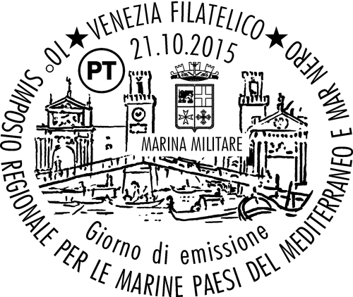 | Vignetta | riproduce l’opera pittorica Il Ponte sull’Arsenale del Canaletto (Collezione Duca di Bedford), su cui si incastona, in alto a destra, lo stemma della Marina Militare. Completano il francobollo la leggenda “10° SIMPOSIO REGIONALE PER LE MARINE DEI PAESI DEL MEDITERRANEO E DEL MAR NERO”, la data “21 - 23 OTTOBRE 2015”, la scritta “ITALIA” e il valore “ € 0,95”. |