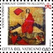 La Pasqua è la principale festa della Chiesa Cattolica ed il perché possiamo comprenderlo direttamente dalle parole del Santo Padre: "...è il culmine del Vangelo, è la Buona Notizia per eccellenza. Gesù, il crocifisso, è risorto! Questo avvenimento è alla base della nostra fede e della nostra speranza: se Cristo non fosse risorto, il Cristianesimo perderebbe il suo valore; tutta la missione della Chiesa esaurirebbe la sua spinta, perché è da là,; che è partita e che sempre riparte. Il messaggio che i cristiani portano al mondo è che Gesù, l'Amore incarnato, è morto sulla croce per i nostri peccati, ma Dio Padre lo ha risuscitato e lo ha fatto Signore della vita e della morte. In Gesù, l'Amore ha vinto sull'odio, la misericordia sul peccato, il bene sul male, la verità sulla menzogna, la vita sulla morte". Per i cristiani questa dunque deve sempre essere una festa di gioia perché è la dimostrazione che quella di Gesù Cristo non era una promessa vana. Quest'anno l'Ufficio celebra la ricorrenza con un minifoglio di quattro valori. I francobolli raffigurano, come di consueto, un particolare della Risurrezione questa volta tratto da una rappresentazione dell'ignoto Maestro del Crocifisso di Trevi conservata presso la Pinacoteca dei Musei Vaticani. Nostro Signore Gesù Cristo esce dalla tomba tenendo in mano il vessillo che simboleggia la Sua vittoria sulla morte mentre le guardie dormienti, ai piedi del sepolcro, rimarcano la separazione tra la sfera terrestre e quella divina.