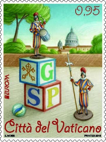 La tematica scelta quest'anno da Post Europ per le emissioni congiunte tra i paesi membri è quella dei "vecchi giocattoli". I giocattoli, che rappresentano un momento importante nella fase di crescita e sviluppo del bambino, sono oggi caratterizzati da una rapida evoluzione divenendo spesso un fenomeno di costume di breve o brevissima durata. Alcuni di essi però resistono alle mode continuando ad attirare l'attenzione dei più piccoli perché sono entrati nel bagaglio culturale della società: soldatini e bambole ad esempio accompagnano la storia dell'uomo fin dai tempi antichi. L'Ufficio Filatelico e Numismatico ha realizzato per l'occasione una serie filatelica di due francobolli con i disegni dell'artista Stefano Morri che riproduce alcuni giocattoli che, seppur "vecchi", possono rappresentare non solo l'oggetto ma un simbolo universale del gioco stesso del bambino. Nel valore da 95 centesimi di euro ancora soldatini, due guardie svizzere pontificie che vestono quella che è, probabilmente, la divisa più famosa del mondo. Una delle due guardie suona un tamburo l'altra porta il classico equipaggiamento dell'alabarda, ancora oggi in uso oltre che nelle cerimonie ufficiali anche in alcuni servizi di sentinella. I dadi con le lettere iniziali del Corpo ed una biglia di vetro completano il primo piano del disegno. In secondo piano, il profilo della Basilica di San Pietro in una vista ideale da una terrazza di un palazzo di Roma.