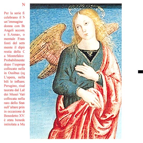 Questo francobollo è stato emesso sia in fogli che in libretti. I singoli francobolli, provenienti dal foglio o dal libretto, hanno aspetto identico. Per la serie filatelica ed il libretto che celebrano il Natale 2009 è stata scelta un’immagine che riproduce la «Madonna con Bambino in trono tra due Angeli accompagnata da S.Gioacchino e S.Anna», opera del pittore rinascimentale Francesco Melanzio. Alcune fonti del settecento collocano inizialmente il dipinto all’interno della sagrestia della Chiesa di San Francesco a Montefalco in provincia di Perugia. Probabilmente fu portato in Vaticano dopo l’espropriazione napoleonica e fu collocato nella Chiesa di San Salvatore in Ossibus (oggi San Pietro in Borgo). L’opera, nella quale sono rintracciabili le influenze del Pinturicchio e del Perugino, risalente al 1516, è stata restaurata dal Laboratorio Restauro Dipinti dei Musei Vaticani ed in seguito è stata collocata nella Cappella del Governatorato dello Stato della Città del Vaticano sull’altare principale. Il 31 maggio 2007, in occasione della visita del Santo Padre al Governatorato, la pala è stata benedetta e la Cappella è stata intitolata a Maria Madre della Famiglia.