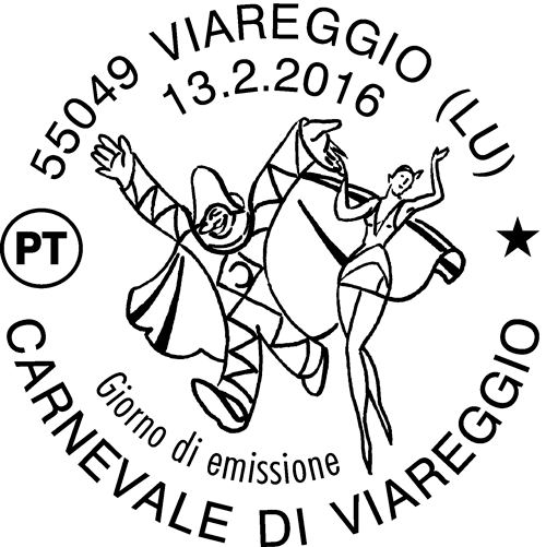 | Vignetta | riproduce un manifesto degli anni ’30 del pittore futurista Uberto Bonetti che ritrae i personaggi di Burlamacco, maschera ufficiale del Carnevale di Viareggio, e la compagna Ondina, entrambi nati dal pennello dello stesso pittore. Completano il francobollo la scritta “ITALIA” e il valore “€ 0,95”. |