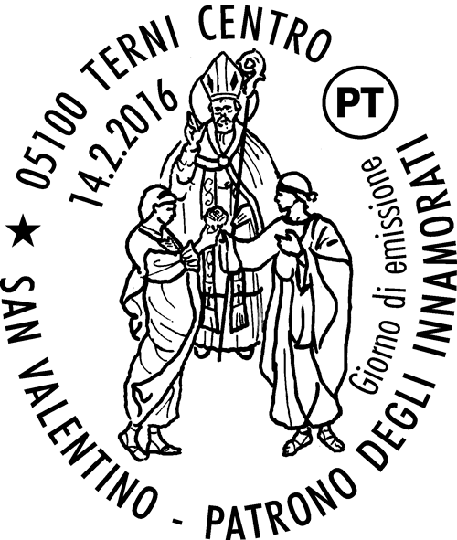 | Vignetta | riproduce una vetrata della Basilica di Terni dedicata a San Valentino e raffigurante il Santo che benedice Sabino e Serapia, due giovani innamorati. Completano il francobollo la leggenda “SAN VALENTINO”, la scritta “ITALIA” e il valore “ € 0,95”. |