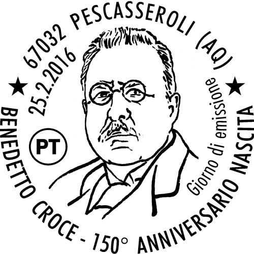 | Vignetta | raffigura, racchiuso in un cerchio in primo piano su un fondino con motivi decorativi, un ritratto del filosofo e uomo politico Benedetto Croce. Completano il francobollo la leggenda “BENEDETTO CROCE”, le date “1866 1952”, la scritta “ITALIA” e il valore “ € 0,95”. |