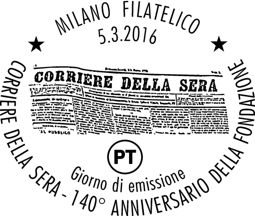 | Vignetta | raffigura la prima pagina del quotidiano “Corriere della Sera”, pubblicato per la prima volta a Milano il 5-6 marzo 1876. Completano il francobollo le date “1876 2016”, la leggenda “140 ANNI DI STORIA”, la scritta “ITALIA” e il valore “€ 0,95”. |