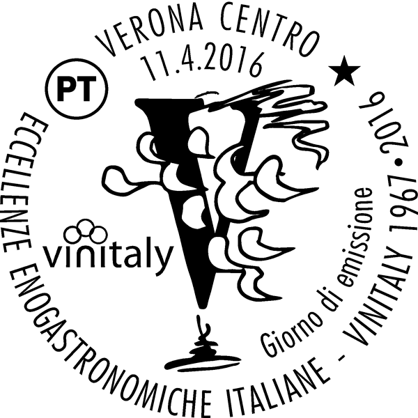 | Vignetta | riproduce la rivisitazione in chiave moderna del primo storico marchio di Vinitaly ; è riportata la scritta “VERONAFIERE” tratta dall’omonimo emblema istituzionale dell’Ente Autonomo per le Fiere di Verona. Completa il francobollo la leggenda “SALONE INTERNAZIONALE DEI VINI E DEI DISTILLATI”, le date “1967 2016”, la scritta “ITALIA” e il valore “€ 0,95”. |