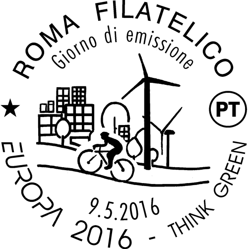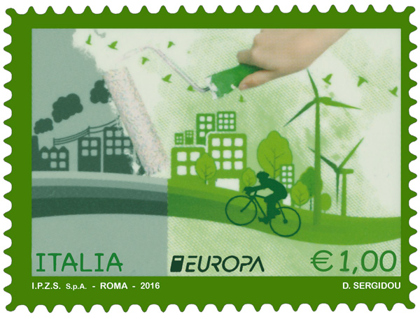 Vignettasono dedicate al tema comune “ECOLOGIA IN EUROPA - PENSA VERDE” e raffigurano rispettivamente: • per il valore di € 0,95, un albero che, idealmente, abbraccia con i suoi rami il globo terrestre; • per il valore di € 1,00, la contrapposizione tra una città inquinata ed un’altra che rispetta la natura e l’ambiente su cui si evidenzia la mano di un uomo intento a colorare di verde la città inquinata. In entrambe le vignette è presente il logo “Europa”. Completano ciascun francobollo la scritta “ITALIA” e i rispettivi valori “ € 0,95” e “ € 1,00”.