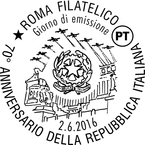 | Vignetta | il francobollo dedicato al 70° anniversario della Repubblica raffigura una veduta del monumento dedicato a Vittorio Emanuele II, conosciuto anche come Vittoriano e Altare della Patria, sorvolato dalle Frecce Tricolori, la Pattuglia Acrobatica dell’Aeronautica Militare Italiana; in alto a sinistra è riprodotto lo stemma della Repubblica Italiana |