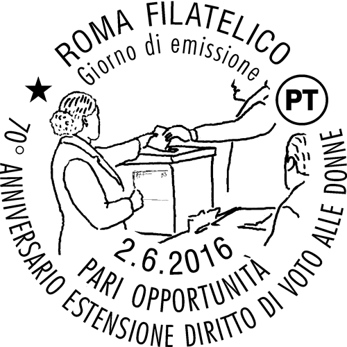 | Vignetta | il francobollo dedicato al suffragio femminile riproduce un’immagine d’epoca che raffigura una donna nell’atto di inserire nell’urna la propria scheda elettorale nel corso delle elezioni amministrative del marzo e aprile 1946, le prime in Italia in cui fu esteso il diritto di voto alle donne |