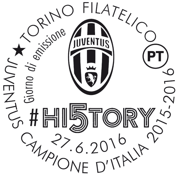 | Vignetta | raffigura un particolare delle tribune dello “Juventus Stadium” con la scenografica scritta: “HI5TORY”. Completano il francobollo la leggenda “CAMPIONI D’ITALIA 2012 - 2013 - 2014 - 2015 - 2016”, la scritta “ITALIA” e il valore “ € 0,95”. |