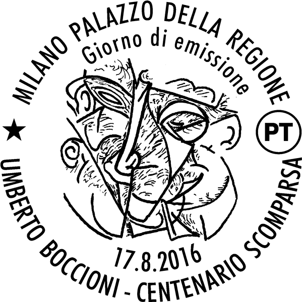 riproduce un dipinto di Umberto Boccioni denominato “Dinamismo di una testa d’uomo”, realizzato nel 1914 e conservato presso il Museo del Novecento di Milano. Completano il francobollo le leggende “UMBERTO BOCCIONI”, “DINAMISMO DI UNA TESTA D’UOMO” e le date “1882 - 1916”, la scritta “ITALIA” e il valore “€ 0,95”.