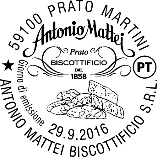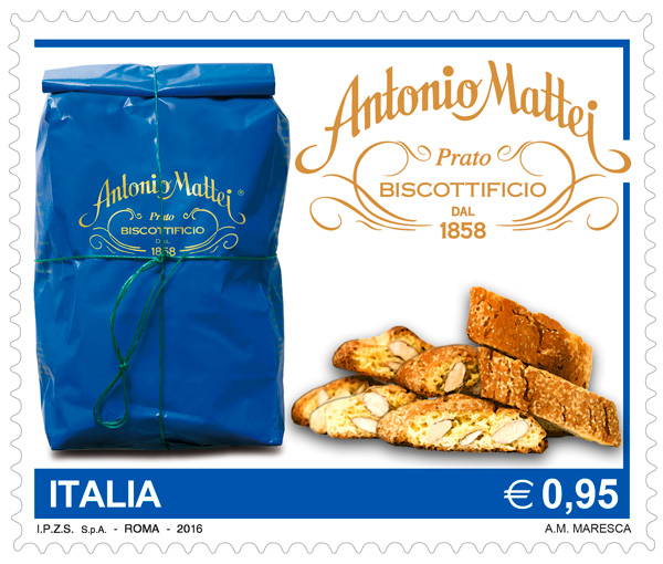 | Vignetta | riproduce, a sinistra, il caratteristico sacchetto blu legato a mano del Biscottificio Antonio Mattei, affiancato, a destra, dai tipici biscotti “cantuccini”; in alto campeggia il logo dell’azienda dolciaria. Completano il francobollo la scritta “ITALIA” e il valore “ € 0,95”. |