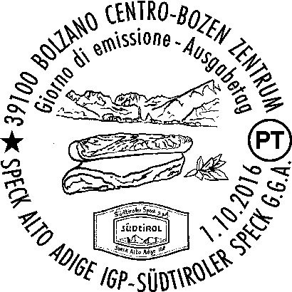 | Vignetta | raffigura in primo piano lo Speck Alto Adige IGP sullo sfondo di una veduta del paese di Santa Maddalena in Val di Funes, nel cuore della zona in cui si produce, sovrastato dal gruppo montuoso delle Odle, nelle Dolomiti; in basso a destra è riprodotto il marchio del prestigioso prodotto italiano. Completano il francobollo la leggenda “SPECK ALTO ADIGE IGP” , la scritta “ITALIA” e il valore “€ 0,95”. |