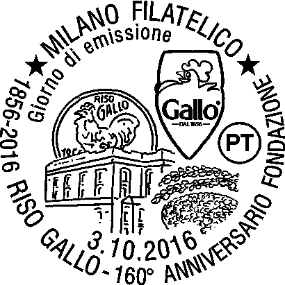 | Vignetta | riproduce, sullo sfondo, il marchio storico del Riso Gallo affiancato dal logo attuale della prestigiosa industria risiera italiana; in primo piano spiccano, a sinistra, un particolare dell’antica fabbrica di Genova del 1856 e, a destra, una ciotola di riso con una spiga. Completano il francobollo la leggenda “CENTOSESSANT’ANNI DI RISO”, le date “1856 2016”, la scritta “ITALIA” e il valore “ € 0,95”. |
