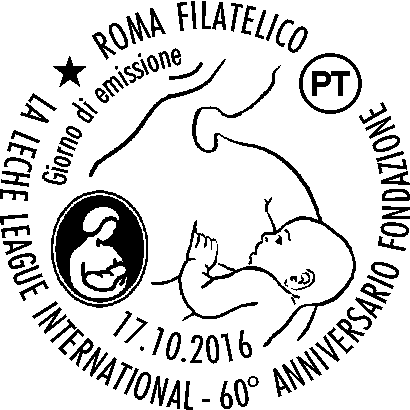 | Vignetta | raffigura un bambino allattato al seno materno, la cui composizione è ispirata dal logo de “La Leche League International” che è riprodotto in basso, a sinistra. Completano il francobollo la leggenda “LA LECHE LEAGUE INTERNATIONAL”, le date “1956 - 2016”, la scritta “ITALIA” e il valore “€ 0,95”. |